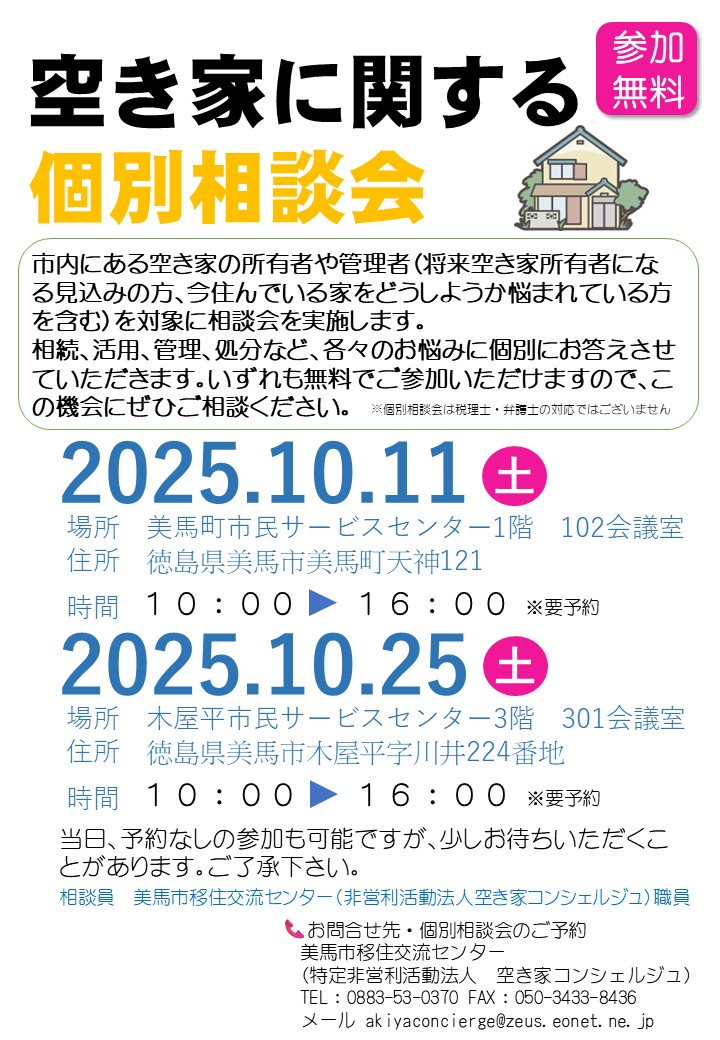 【参加費無料】空き家に関する個別相談会(美馬町・木屋平)10月開催のお知らせ